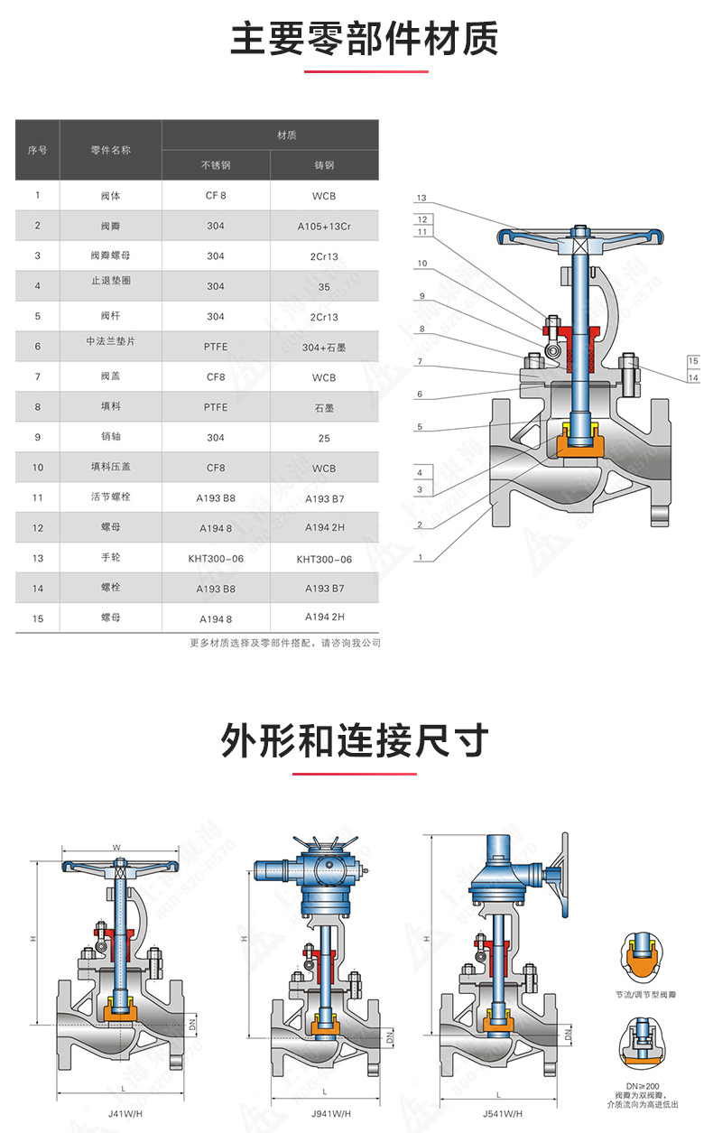 J41型國標不銹鋼法蘭截止閥, 為上海東海泵閥制造有限公司自主研發生產。本產品設計制造標準符合GB/T12235-89標準其啟閉件是圓柱形的閥瓣,密封面呈平面或錐面,閥瓣沿流體的中心線作直線運動。國標截止閥只適用于全開和全關,一般不用來調節流量,定做時允許作調節和節流。