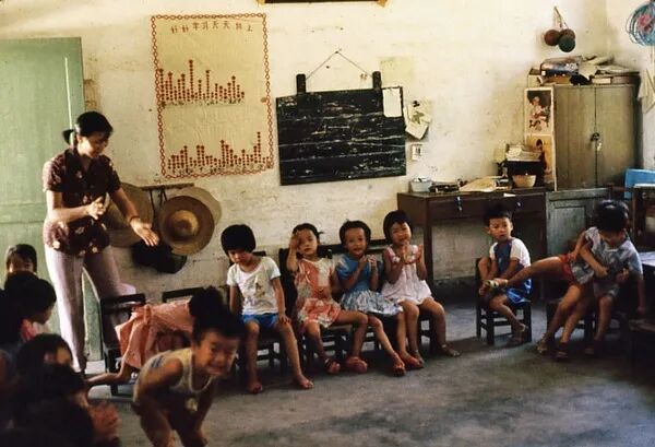 課堂上,教室里裝潢簡單又特別有那個時代的特色,孩子們踴躍舉手發言,黑板上似乎在講認人民幣面值。